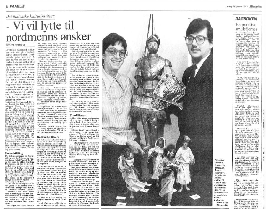 La mostra su Pirandello a Oslo è stata inaugurata il 23 gennaio con una conferenza della professoressa Lone Klem. A febbraio, Silvana Quadri attende una vera chicca per il suo istituto. Verrà proiettato il celebre film muto del 1926 di Amleto Palermi, "Die lebende Maske" o "Enrico IV", tratto da un dramma del grande autore. La proiezione è stata realizzata grazie alla collaborazione tra la Cineteca Nazionale e l’Istituto Cinematografico Norvegese.